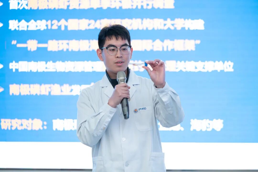 上海海洋大学海洋生物资源与管理学院硕士研究生张恒分享其参与全球首次南极磷虾资源夏季环南极调查的感悟,并向观众展示和介绍了南极磷虾