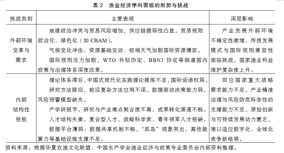 同时应该看到,“十五五”时期渔业经济学科在迎来重大发展机遇的同时,也面临着自身发展不适应外部环境快速变革提出新需求的严峻挑战(表2)。“十五五”时期渔业经济学科的发展,是在“外压加剧”与“内功不足”的张力中寻求突破,须“内外兼修”,任重道远。