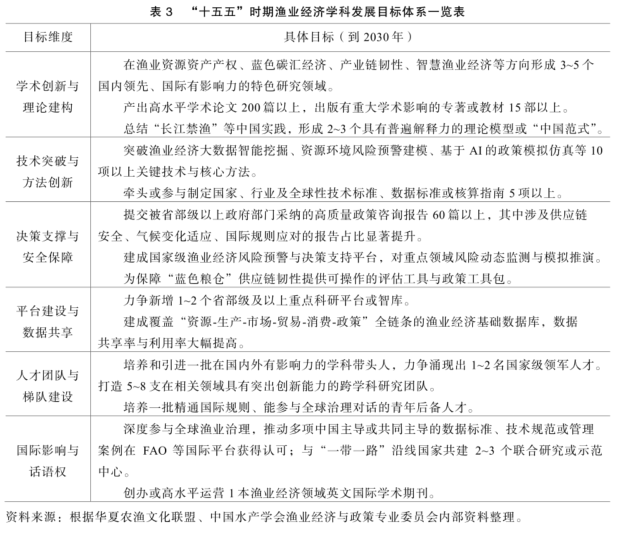到2030年,力争将我国渔业经济学科建设成为服务国家渔业治理现代化的核心智库、引领产业转型的创新引擎、培养高端人才的摇篮、参与并引领全球渔业治理的重要力量。具体目标体系如表3所示。