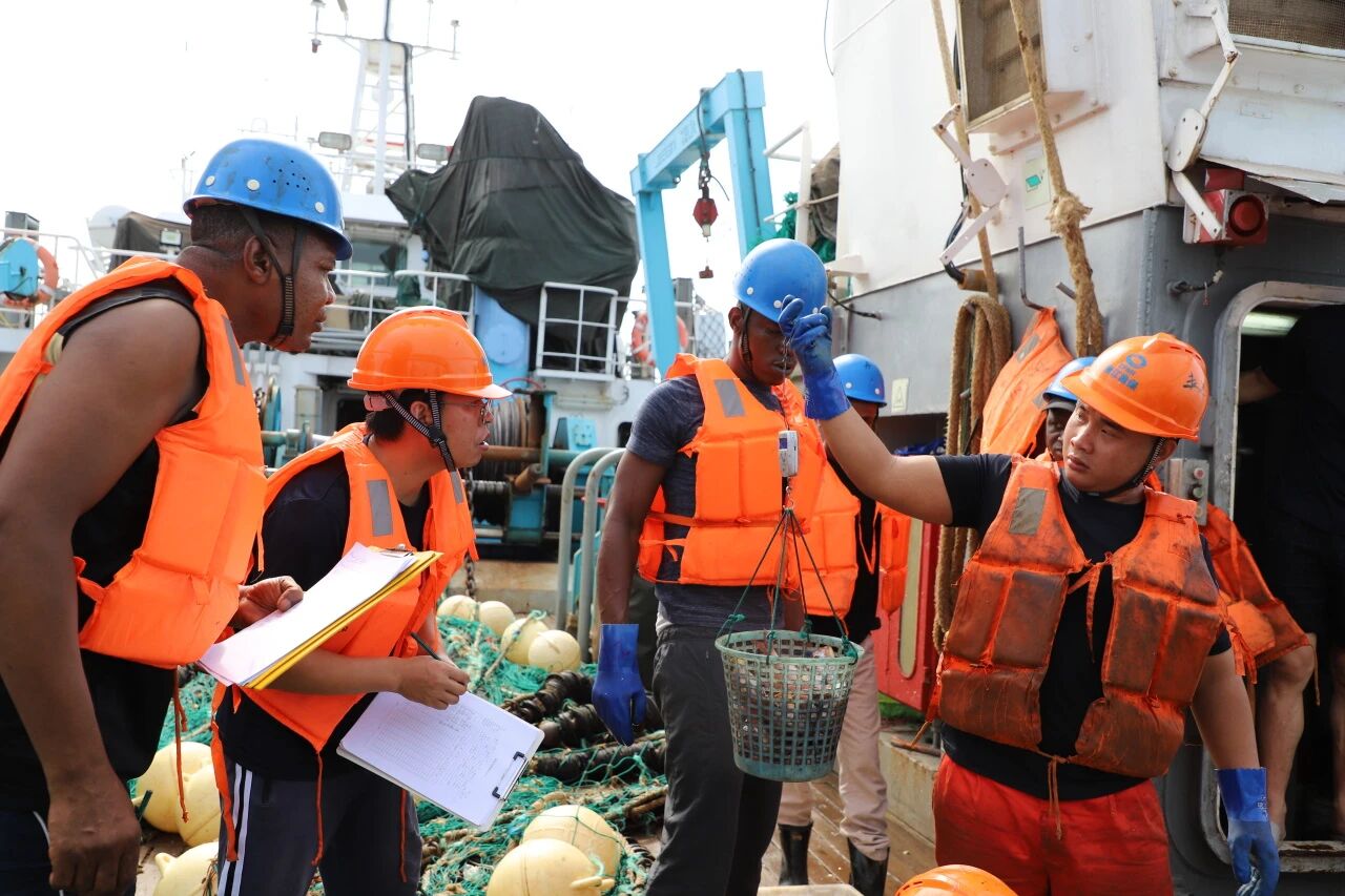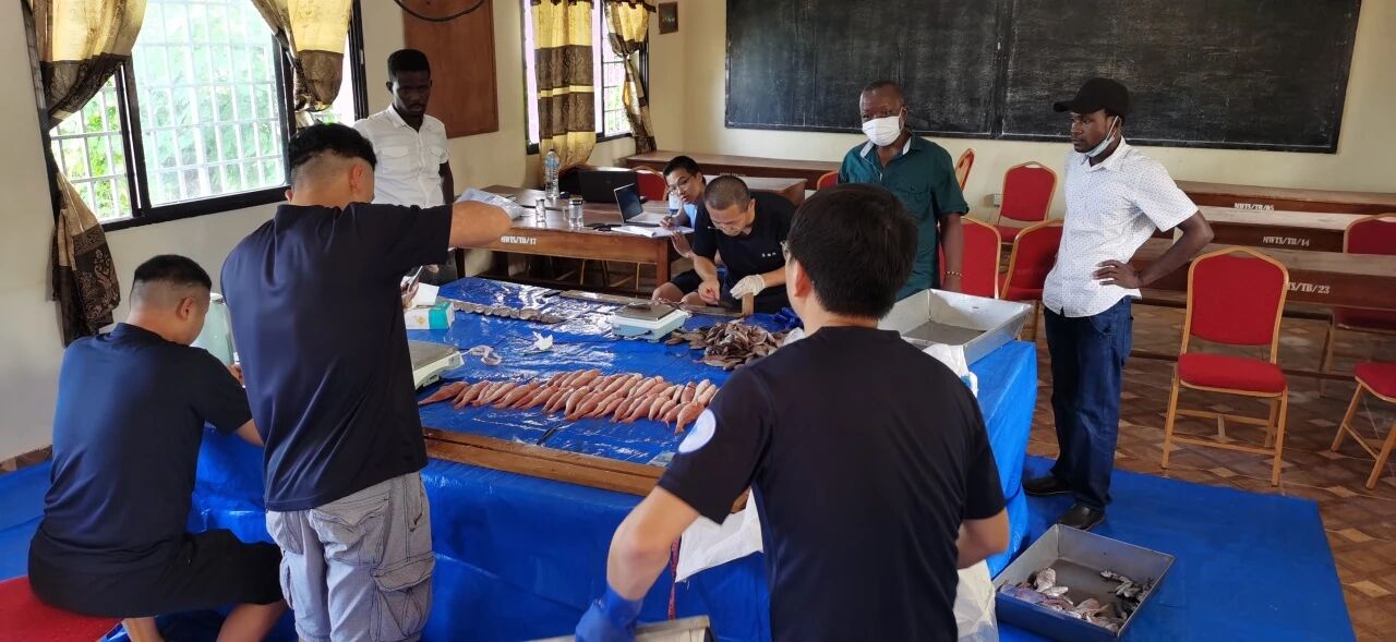 3年时间里,我们共计完成12个航次、527个站位的现场调查任务。调查范围全面覆盖了塞拉利昂专属经济区的陆架和陆坡区海域(即商业渔业主要作业区域)。调查内容丰富多样,涵盖渔业资源、浮游生物、鱼卵仔稚鱼、水文环境等多个方面。通过艰苦努力,项目组共获取鱼卵仔稚鱼样品527份、浮游动植物水样1054件、叶绿素滤膜样品527份、渔业生物组织样本4200余份,采集渔业声学数据87G、渔业生物基础生物学数据9万余条。经过专业细致的鉴别,共识别出渔业生物290余种,并联合编辑出版了《塞拉利昂海域主要渔业资源原色图集》。通过项目的实施,基本摸清了塞拉利昂近海渔业资源本底情况,为渔业资源长期动态监测奠定了科学基础;探明了多种经济种类主要生活史过程,证明了陆坡和深海区在近海底层鱼类资源补充中的关键作用,提出了适当延长休渔期、将陆坡和深海区纳入渔业管理范围的建议;根据渔业资源评估结果,提出了最大可持续捕捞渔获量以及对应的捕捞努力量等适应性渔业管理建议,为促进塞拉利昂海洋渔业资源管理措施的完善提供了科学依据。多项成果填补了塞拉利昂渔业科学研究的空白,得到塞拉利昂海洋资源与渔业部的高度评价。