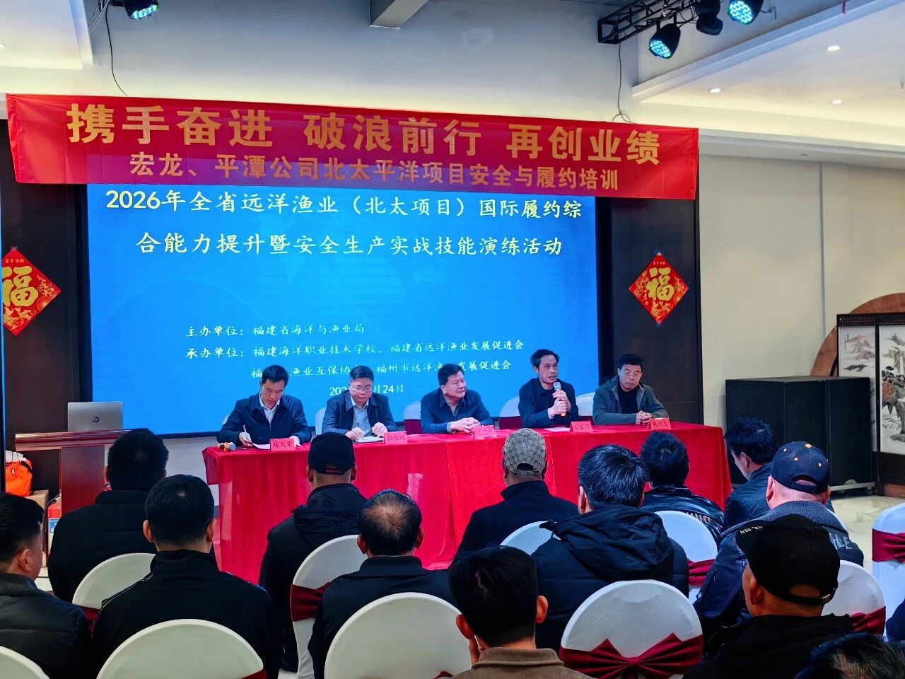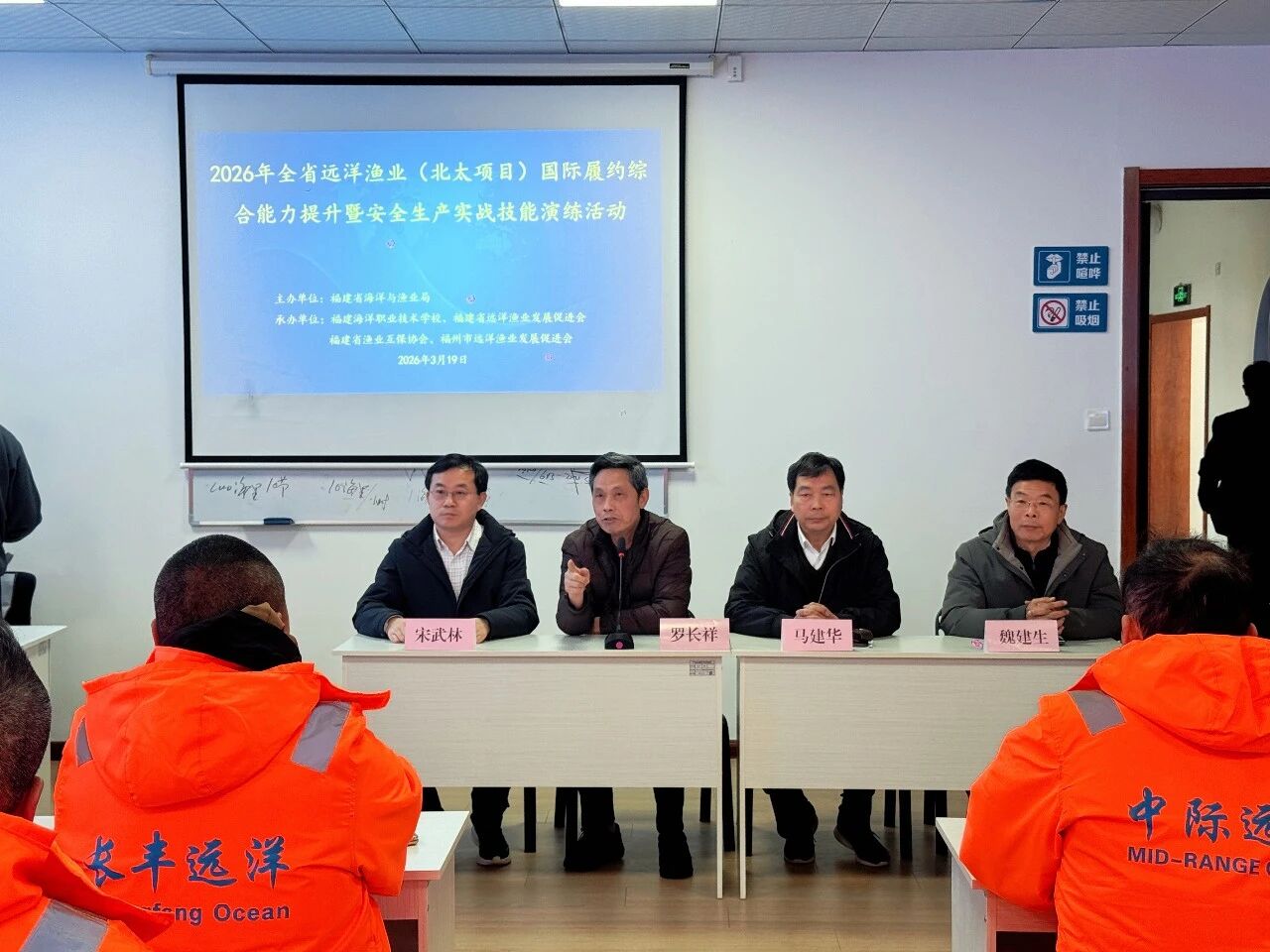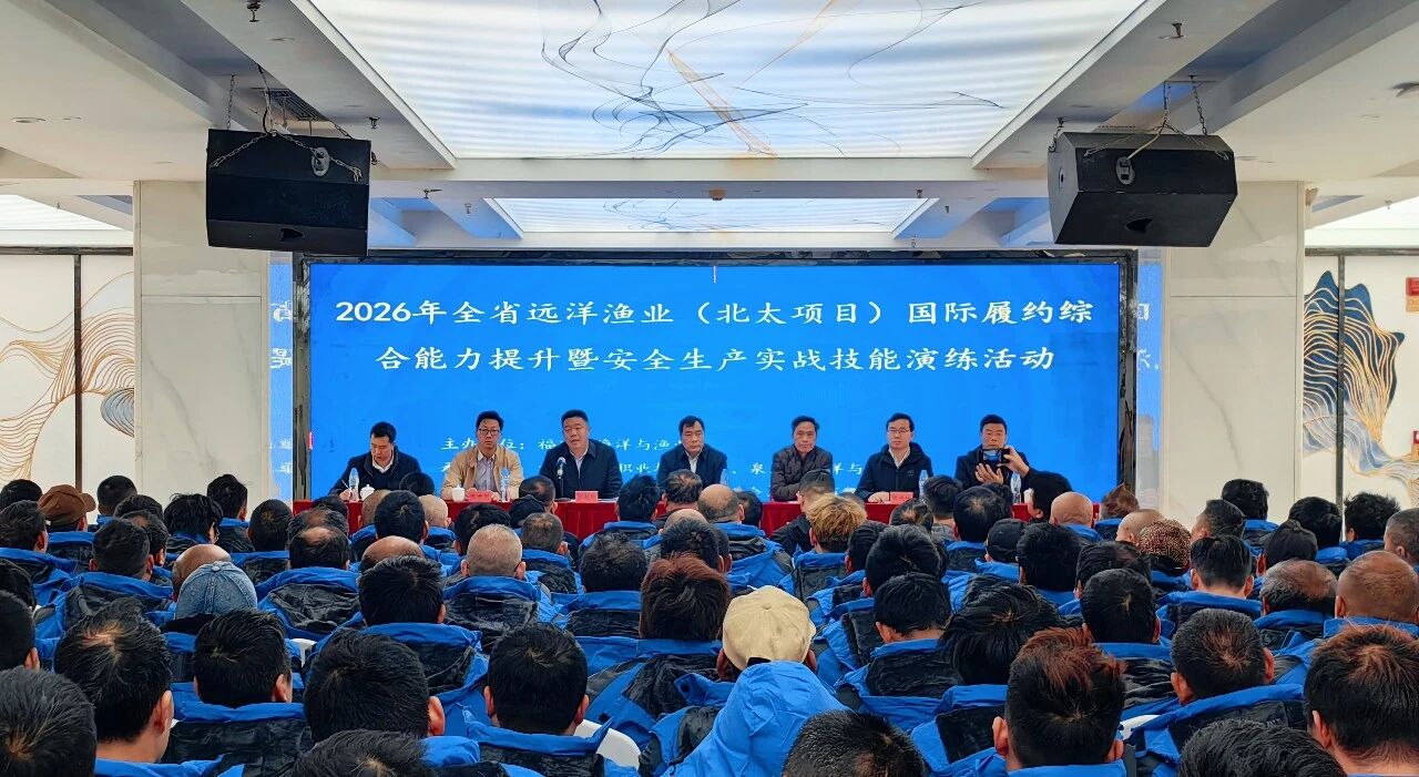 为深入贯彻落实农业农村部及福建省政府关于促进远洋渔业高质量发展的决策部署,全面提升福建省远洋渔业从业人员国际履约素养与安全生产实战能力,3月12日~4月3日,由福建省海洋与渔业局主办,泉州市海洋与渔业局、福建海洋职业技术学校、福建省远洋渔业发展促进会、福建省渔业互保协会、福州市远洋渔业发展促进会联合承办的“2026年全省远洋渔业(北太项目)国际履约综合能力提升暨安全生产实战技能演练活动”,先后在泉州晋江、山东石岛、浙江温岭三地顺利举办并圆满收官。福建省10家北太项目远洋渔业企业的安全生产负责人、管理人员,以及北太项目远洋渔船船长、轮机长等职务船员和普通船员,共计1100余名从业人员参与本次培训演练。