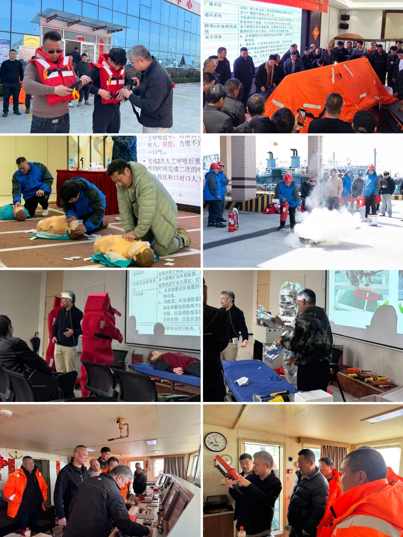 安全生产实战技能演练环节,紧贴远洋渔船作业安全风险防控重点,聚焦灭火器规范操作、救生衣与防火保温服正确穿戴、心肺复苏现场实操、渔船安全隐患排查、机舱二氧化碳灭火系统规范释放等核心应急科目。演练场景模拟远洋作业真实突发状况,参训人员参与现场实操,在沉浸式演练中熟练掌握各类应急设备的使用方法,明晰应急处置全流程规范,进一步强化了安全防范意识,有效提升了团队协作配合能力与突发情况应急反应能力,为远洋作业安全增添了坚实保障。