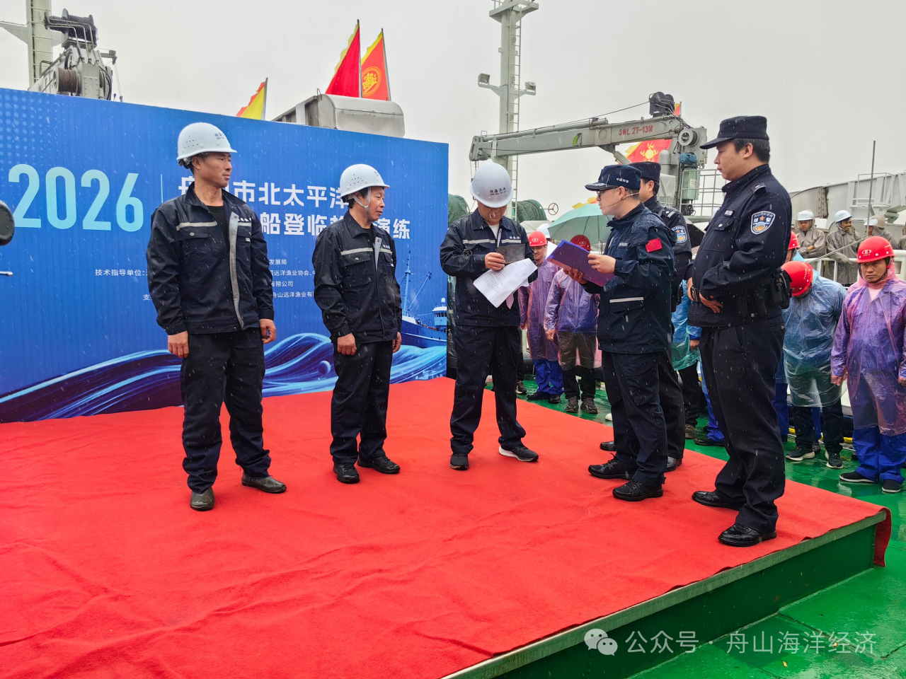 4月3日上午,由舟山市海洋经济发展局主办、舟山绿色渔业有限公司承办,浙江省海洋经济发展厅、中国海警局直属第一局指导的“2026年舟山市北太平洋作业渔船登临检查演练”在舟山市欣海渔业有限公司提供“欣海61”“欣海62”“欣海79”三艘围网渔船上进行。演练通过模拟真实执法场景,全方位提升北太秋刀鱼船、围网船、鱿钓船等远洋船舶船员的国际渔业公约履约意识、登临配合能力及应急处置水平。作为我国首次针对北太平洋公海渔业履约开展的专项登临检查演练,活动为即将赴远洋作业的渔船筑牢合规防线。
