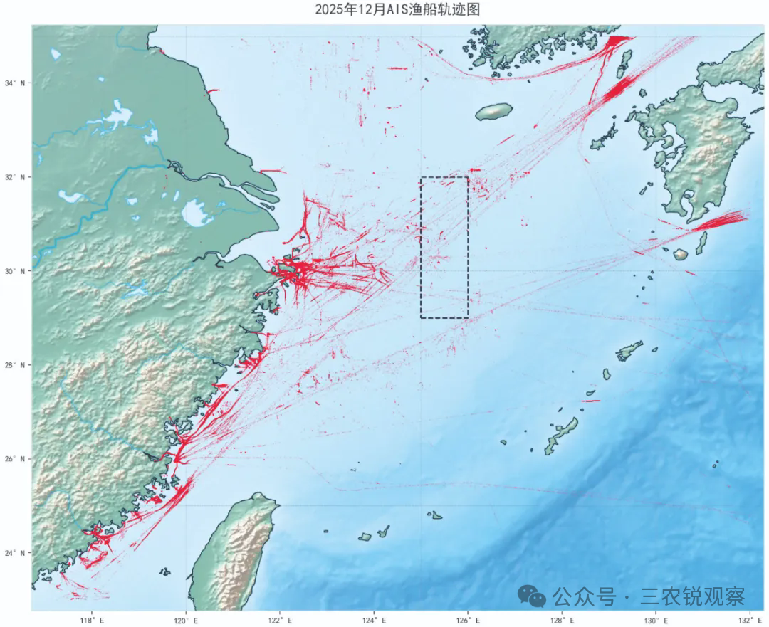 上海海洋大学数据中心提供给记者的一幅数据图则显示,外媒报道中,2025年12月“上千艘中国渔船在某一海域集结成两列数百公里‘平行队形’”的情况并不存在。该中心通过中国渔船的AIS数据绘制的中国近海渔船AIS分布热点图中,在外媒报道划定的区域中,并未出现渔船密集聚集的情况。